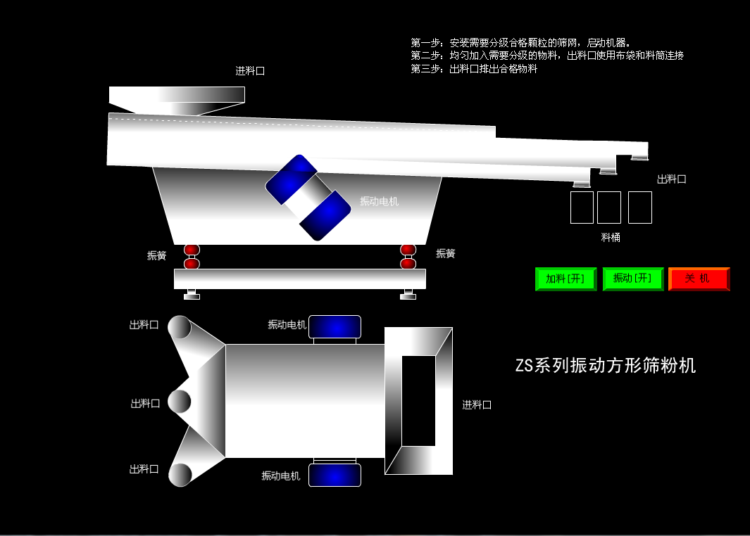 本機(jī)由篩箱,振動(dòng)源及減震器三大部分組成。振動(dòng)機(jī)架與篩箱連接有4-12組軟橡膠減震器上下固定, 產(chǎn)生離心力,由震器控制浮動(dòng)振幅,